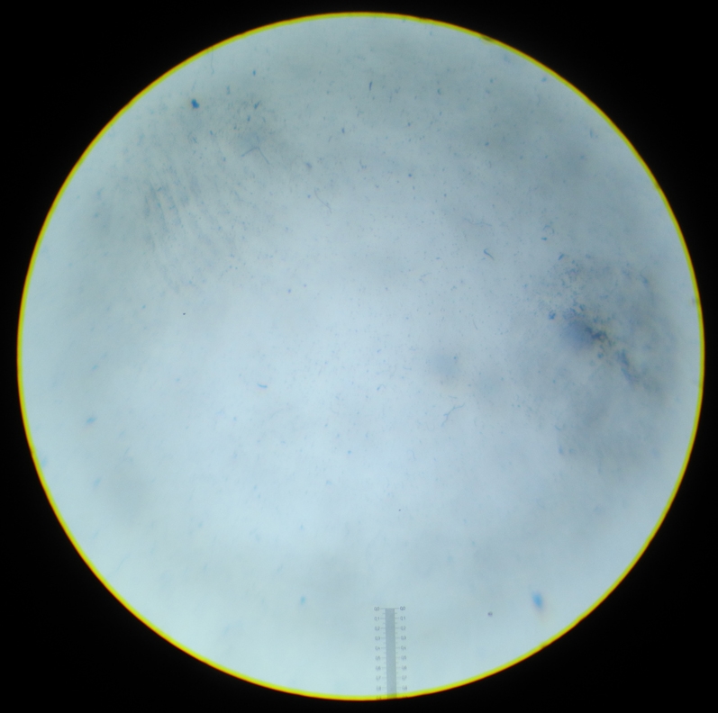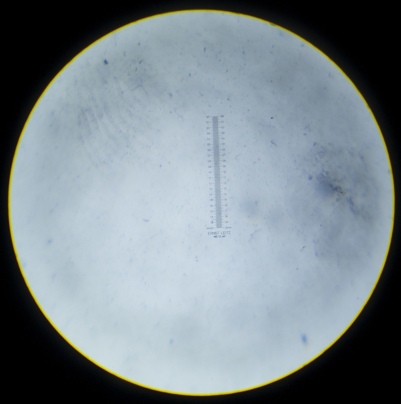 Besonders bei niedrigen Vergrößerungen und eingesetzer Anpassungslinse ist dieser Abdruck überdeutlich unter dem Präparat sichtbar (ebenso wie alle kleinen Kratzer und Stäubchen auf dem Spiegel.
