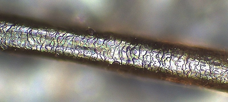 Will ich vor allem die Oberflächenstruktur sehen, brauche ich bei der Durchlichtmikroskopie einen Brechungsindex, der sich stark von dem des Haares unterscheidet, also entweder Luft oder sowas wie für die Diatomeen mit besonders hohem Brechungsindex. Dauerpräparate von Haaren habe ich bisher in Pleurax und in meltmount eingeschlossen.