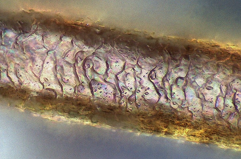 Hier ein Haar vom Caribou. Die Schuppenschicht sieht eben etwas anders aus als beim menschlichen Haar. Nur ein Schuss mit einem 40er Objektiv. Deshalb eben nur oben scharf, das reicht aber normalerweise.