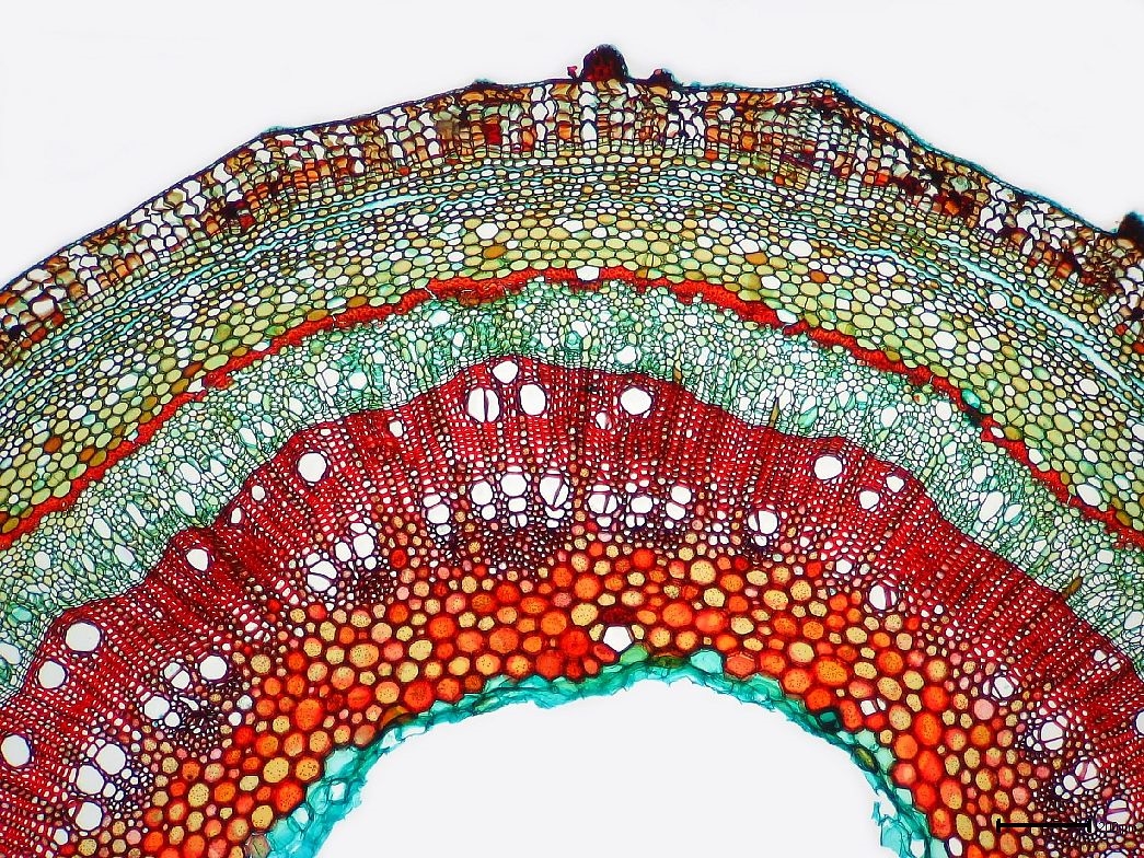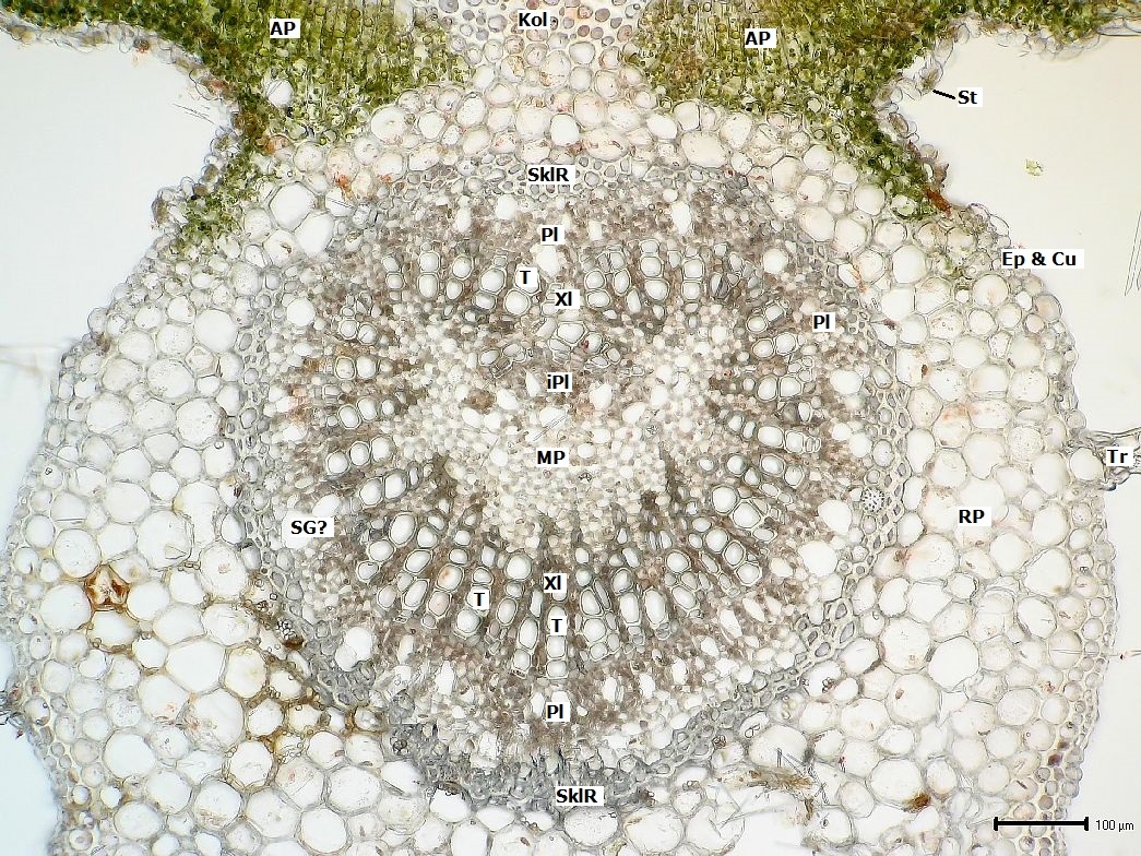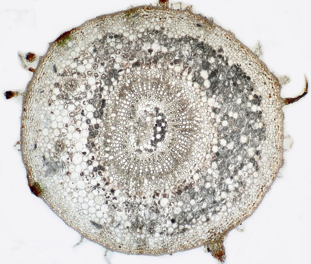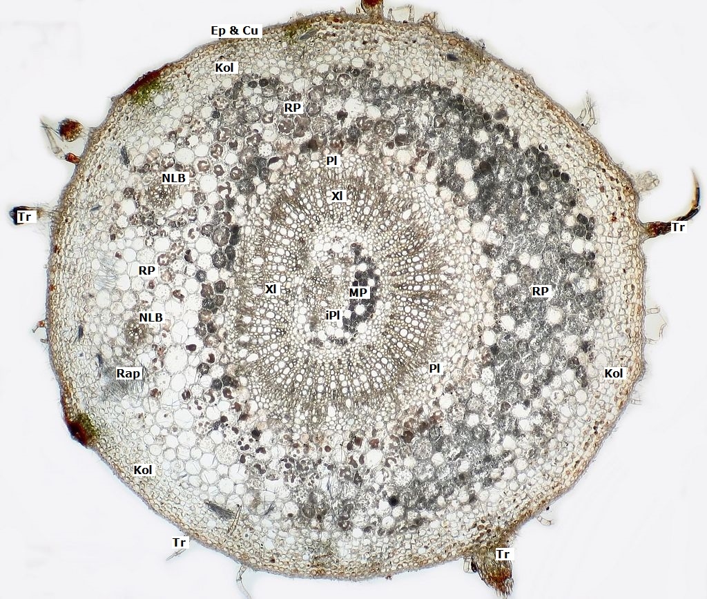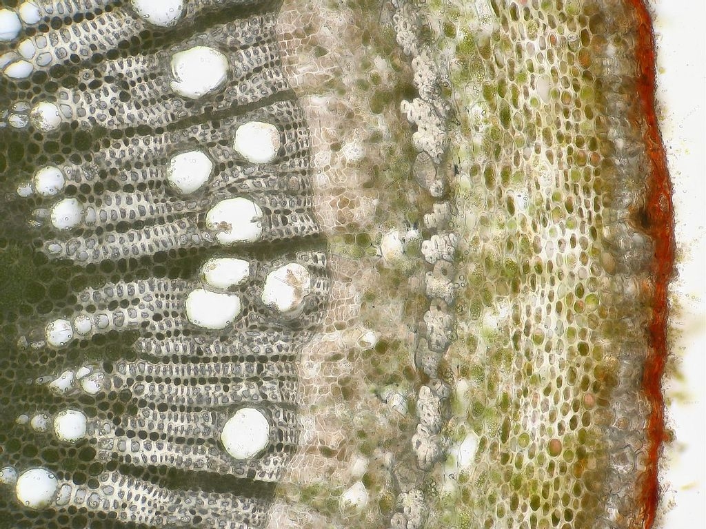 Von außen nach innen: das sekundäre Dickenwachstum hat bereits eingesetzt, wir sehen ein Periderm mit mehrreihigem Phellem, darauf die Reste eines der großen Trichome. Darunter liegt das Rindenparenchym. Die Lücken zwischen den Zellreihen rühren von einem zu lange dauernden Bad im Klorix her - es sind Präparationsartefakte. zwischen dem Rindenparenchym und dem Phloem liegt ein Gürtel von Steinzellen und im Phloem finden wir deutlich vergrößerte Zellen - vielleicht die Quelle des an den frischen Schnitten beobachteten Schleims. Darauf folgt das Xylem mit Tracheiden und ohne weitere Besonderheiten und ganz innen liegen sklerifizierte Zellen des äußeren Markparenchyms.