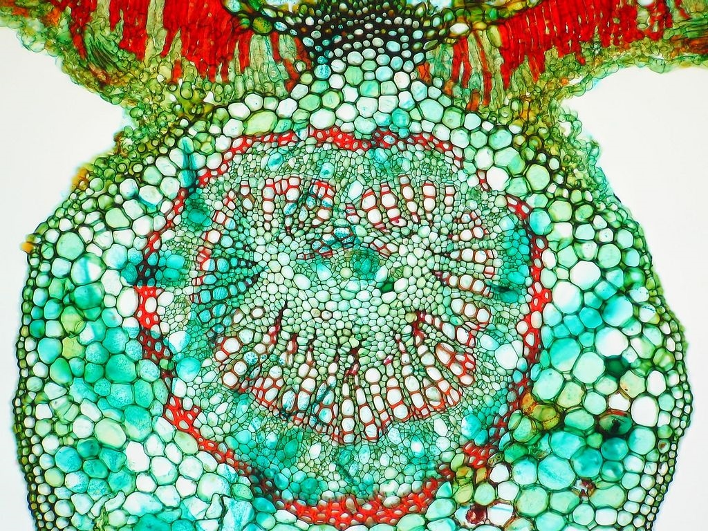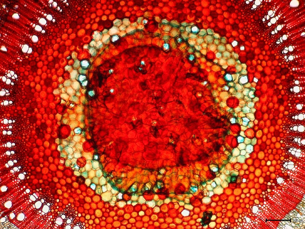 Schön hier wieder das innen liegende Phloem mit seinem eigenen Xylem, das diesmal deutlich vom darüber liegenden Xylem des Leitbündelrings abgesetzt ist. Auch die großen Zellen im Phloem (außen wie innen!), die ich als Sekretgänge anspreche, sind wieder da und in den gefärbten Schnitten wieder die sattsam bekannten Artefakte.