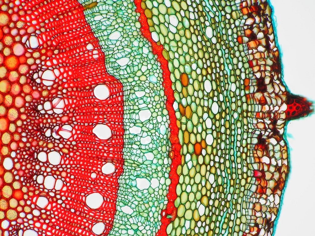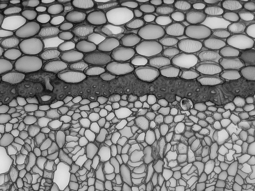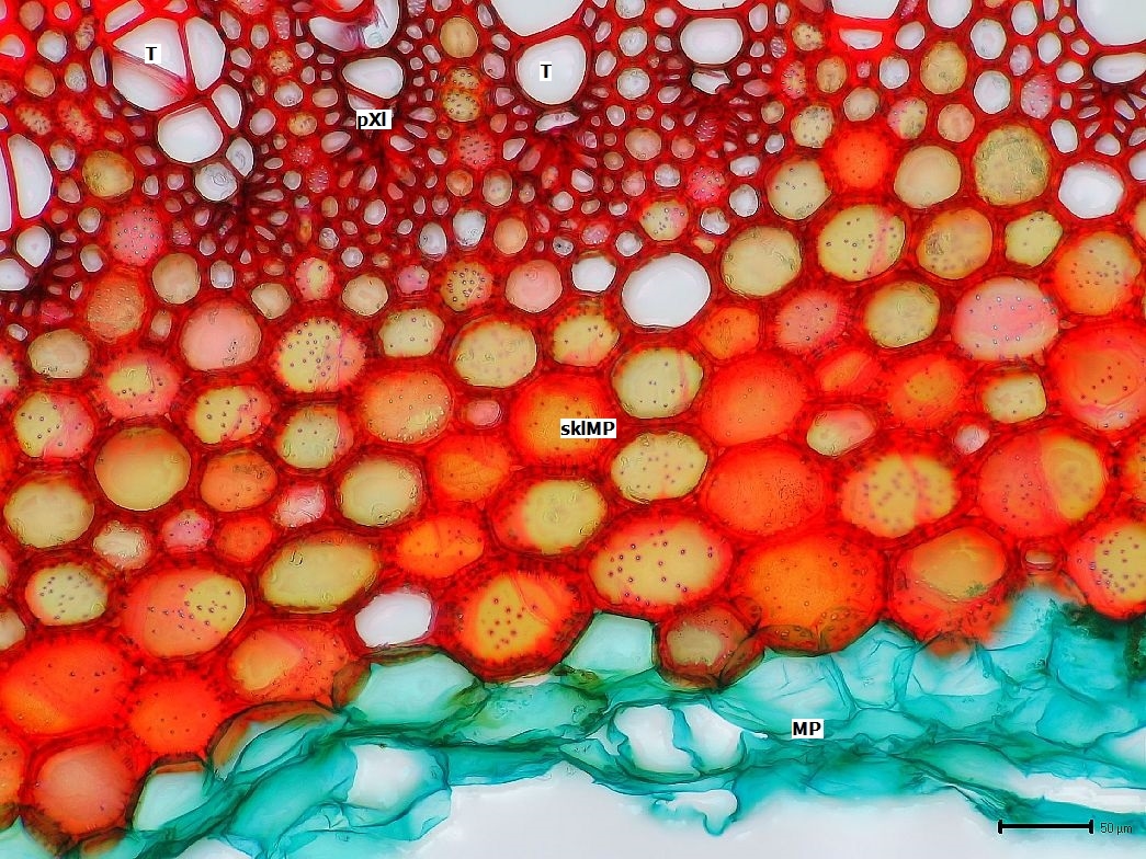 Statt eines Sklerenchymrings finden wir hier einen schmalen Streifen von Steinzellen mit stark verdickten Zellwänden zur Stabilisierung des Sprosses und zum Schutz der Leitgewebe. Aufgrund der Rot-Schwäche meiner Kamera auch in Graustufen: Bild 11c lässt einige Details feiner hervortreten.