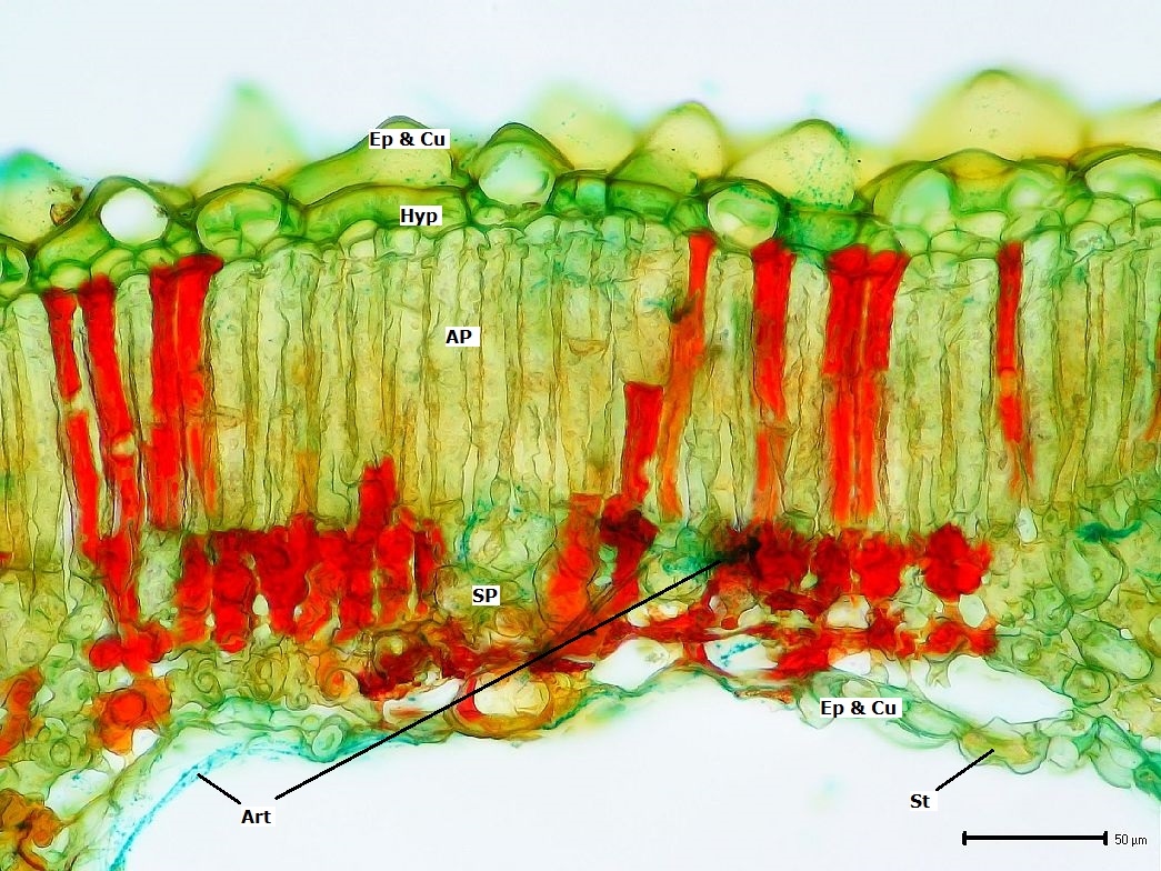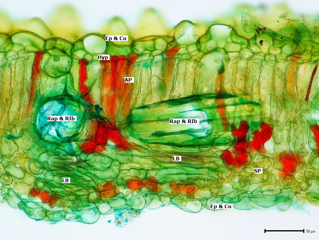 Wir sehen den klassischen Aufbau eines bifazialen Laubblattes mit einem mächtigen Palisadenparenchym 8Assimilationsparenchym, AP) und dem darunter liegenden Schwammparenchym und noch einmal deutlicher die kegelförmigen Zellen der Epidermis an der Blattoberseite. Die Cuticula ist nur schwach ausgeprägt und kaum zu erkennen. Unter der Epidermis finden wir an der Blattoberseite eine einreihige Hypodermis. Die Bilder 19a 6 b zeigen in der Mitte unten ein Nebenleitbündel und darüber eine große Zelle, die ich für einen Raphiden-Idioblasten halte. Warum, das werden wir in den folgenden Bildern sehen.