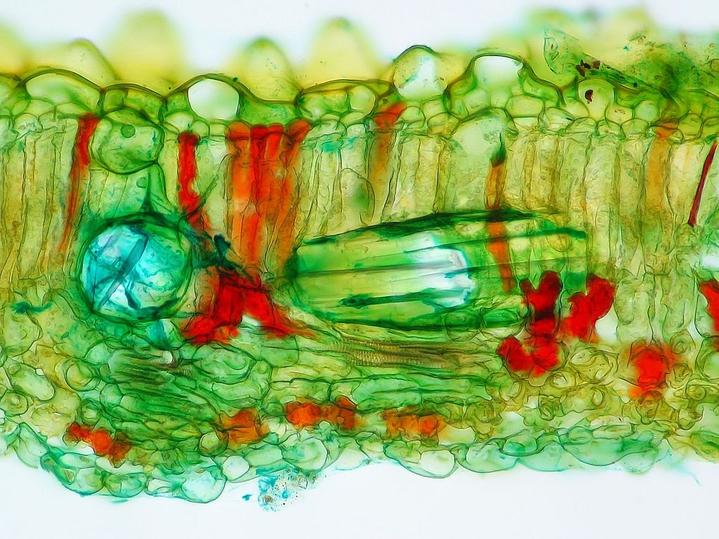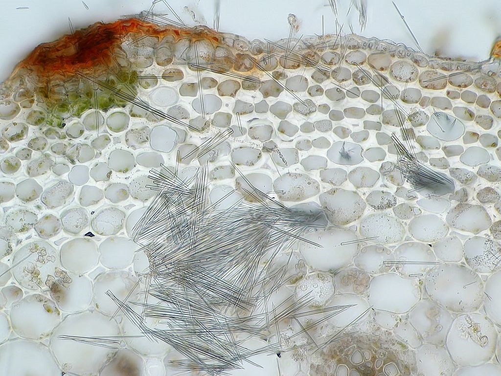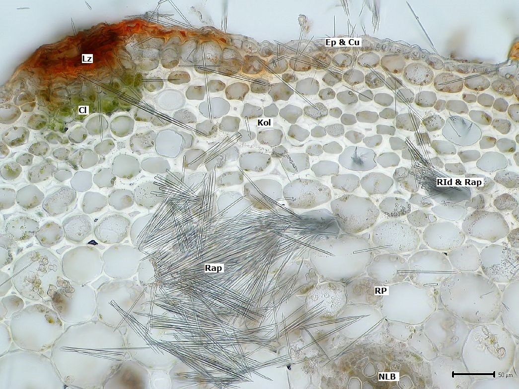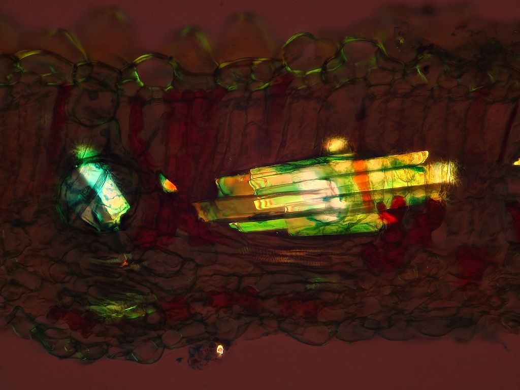 Wie der Spross Raphiden und Schleim aufweist, so ist es auch im Blatt. Den Schleim haben wir in Form der Artefakte schon zu genüge gesehen, machen wir uns also auf die Suche nach den Raphiden.