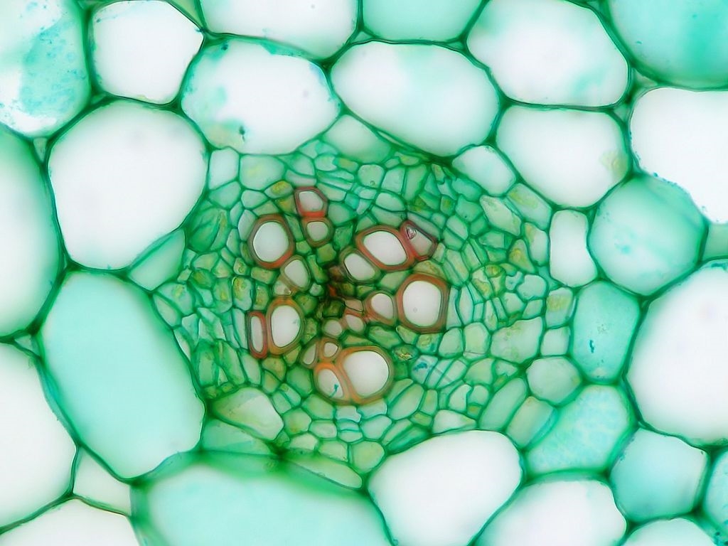 Auffällig: der Spross ist hohl und die blau gefärbten Zellreste am Rand der Höhlung weisen auf eine lysigene Markhöhle hin. Dazu später mehr.