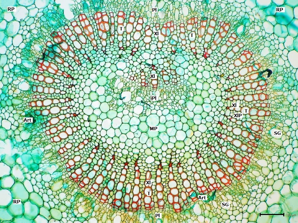 Hier ist das innen liegende Phloem noch einmal gut zu erkennen, und auch der verdickte Xylemring direkt darüber. Die mit SG gekennzeichneten großen Zellen im Phloem halte ich für Sekretgänge, also für die Quellen des Schleims und der Artefakte.