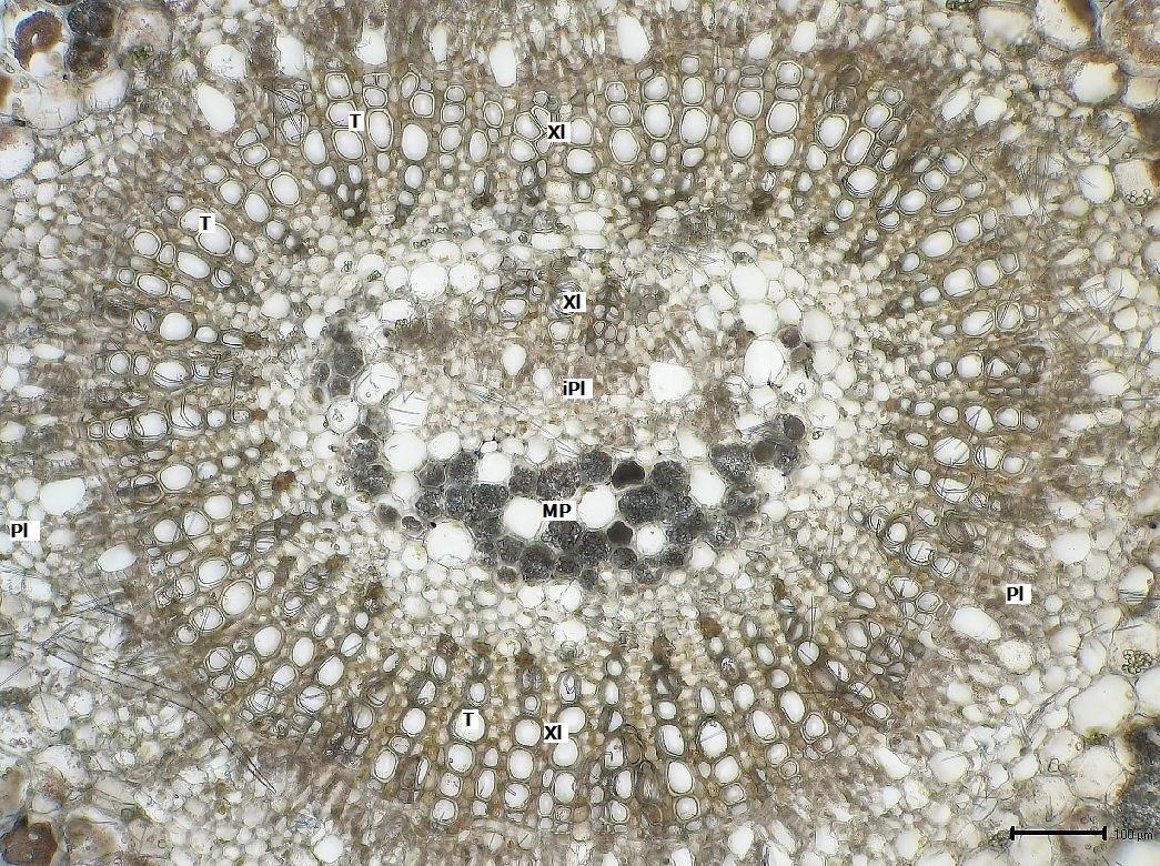 An sich nichts ungewöhnliches - mit zwei Ausnahmen: wie schon angekündigt, zeigt sich der nicht ausgespülte Schleim in Form bläulicher Artefakte über den gesamten gefärbten Schnitt verteilt. Und außerdem finden wir im Leitbündelring ein innen liegendes Phloem (iPl), dem auch ein eigenes Xylem gegenüber liegt. Eine Struktur, die wir so auch im Blattstiel wieder finden werden.