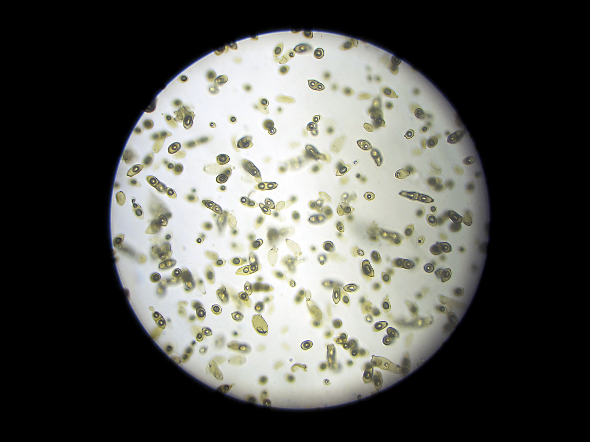 Dein Deckglasverfahren war ja schön erfolgreich und die dunklen Schimmelpilzsporen sind dabei auch im Durchlicht-Hellfeld ohne Färbung gut zu erkennen. Wie Du richtig vermutet hast, handelt es sich bei dem Schimmel eindeutig