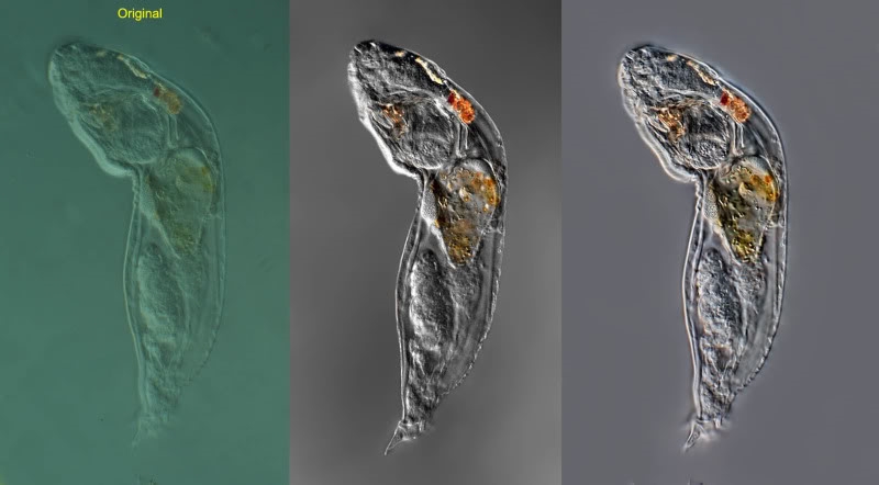 Als Extrembeispiel zeige ich gerne dieses Bild vom Mikrofotl-Workshop in Hagen: Eine katastrophale DIK-Aufnahme eines Rädertiers - in zwei Bearbeitungsversionen von Martin Kreutz und Michael Plewka. Alles klar?