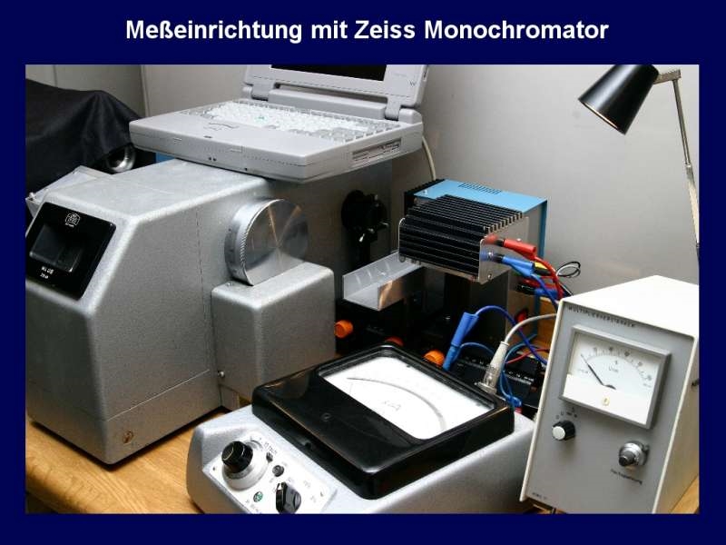 Links der alte Prismenmonochromator, mit einem schwarten Tuch abgedeckt ein Gittermonochromator, falls ein Doppelmonochromator gebraucht wird. Darüber ein kleiner Laptop für die Datenaufzeichnung. Hinten im blauen Gehäuse und davor mit den schwarzen Kühlrippen die Lichtquelle mit Steuereinheit. Eine Halogenlampe mit einem spez. Oberflächenspiegel von Zeiss zur Bündelung auf den Eintrittsspalt mit Schwingblende. Ganz rechts die Hochspannungsversorgung für den Fotomultiplier. Im Vordergrund der Lock-in-Verstärker mit Anzeige und Meßbereichswahl. Der AD-Wandler ist nicht sichtbar.