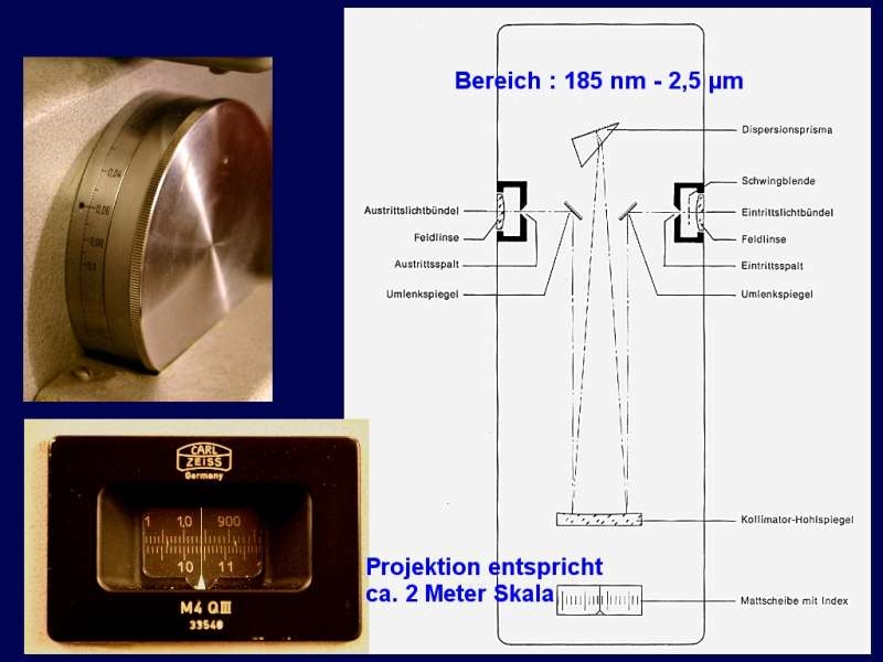 Da bei einem Prismenmonochromator die Bandbreite im Zusammenhang mit Wellenlänge und Spaltbreite steht, muß immer wieder der Ein- und Austrittsspalt nachgeregelt werden. Dazu gibt es Grafiken von Zeiss zu diesem Gerät.