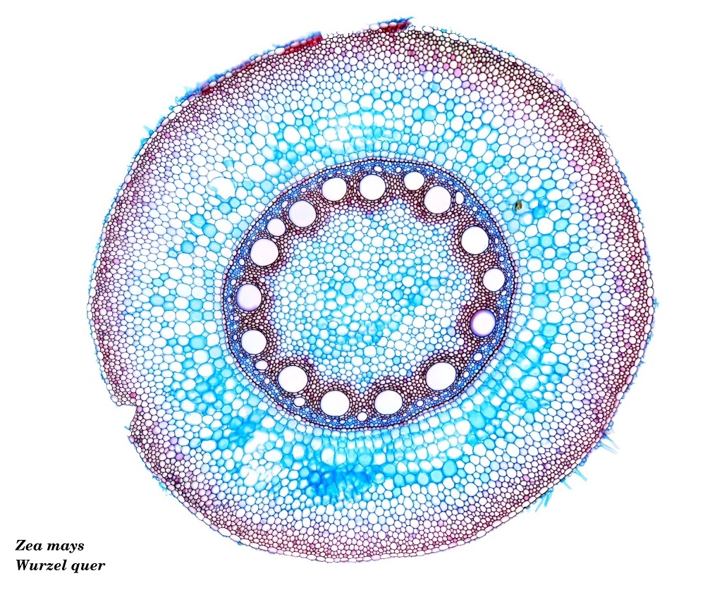 Hier noch eine Schnitt durch die Wurzel von Zea mays, mit Astrablau/Safranin gefärbt: