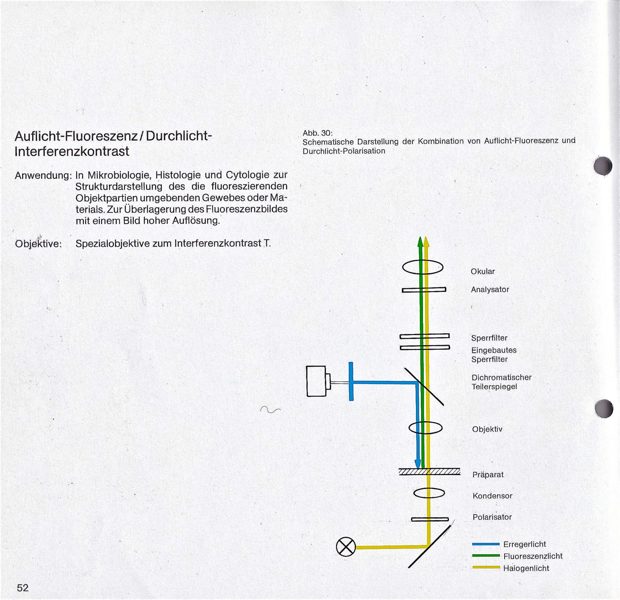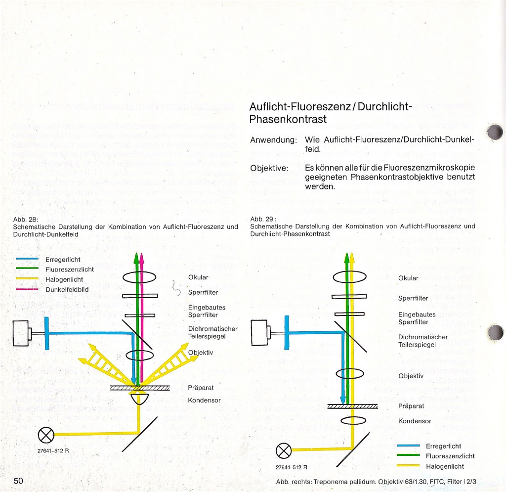 Die Phasenringe im Objektiv stören eigentlich die Auflichtfluoreszenz kaum, man hat dafür ganz gewöhnliches Phasenobjektive, vorzugsweise Neofluare, genommen.