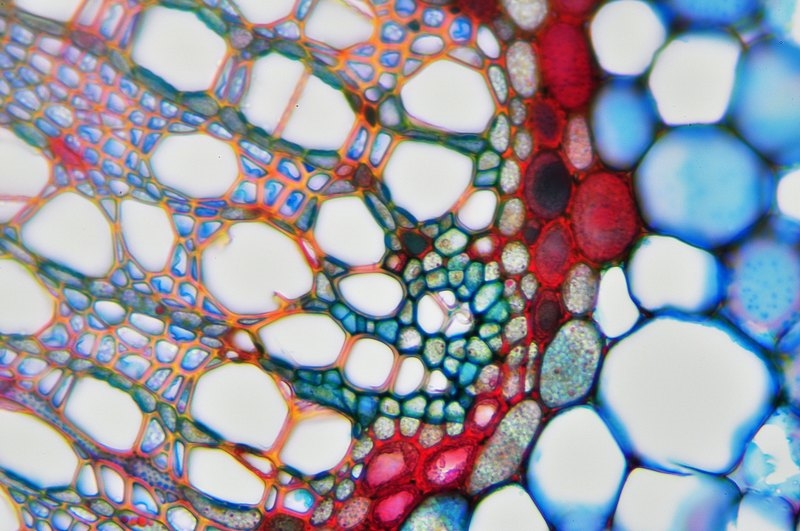 Zellwände blaugrün bis grün, verholzte Zellwände leuchtend rot, Zellwände der äußeren Hypodermis orangerot, Cuticula gelb, Zellwände der innenliegenden Hypodermis tiefrot.
