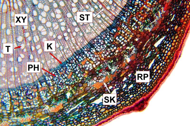 XY= Xylem, T= Trachee, K = mehrschichtiges Kambium, PH = Phloem, ST = Markstrahl, SK = Sklerenchym-Inseln, RP = Rindenparenchym