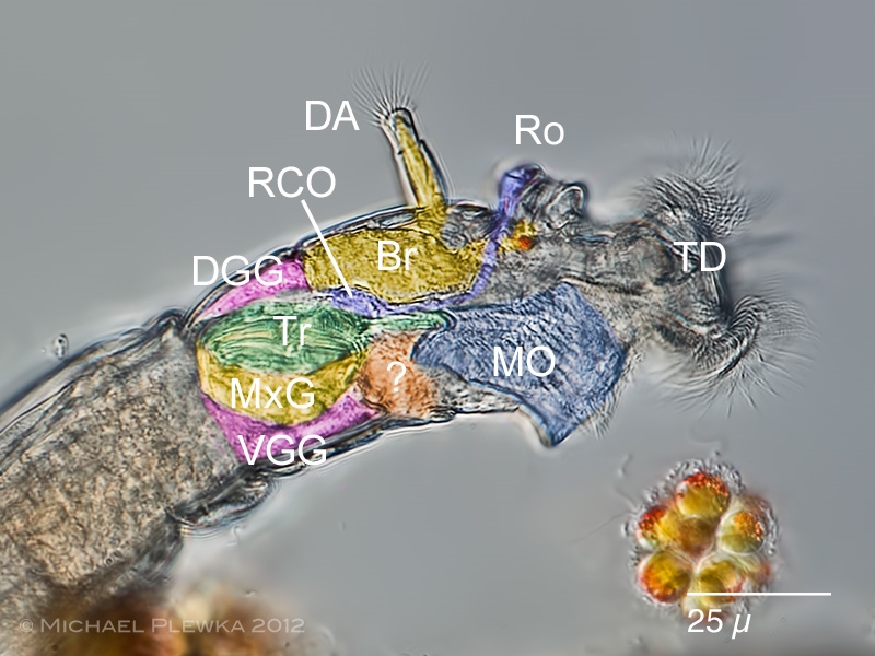 Br: Gehirn; DA: Dorsaltaster; DGG: Dorsale Magendrüse; MO: bewimperte Mundöffnung; MxG: Mastaxganglion; RCO: Retrocerebralsack; Ro: Rüssel; TD: Räderscheiben; Tr: Kauer;  VGG: Ventrale Magendrüsen.