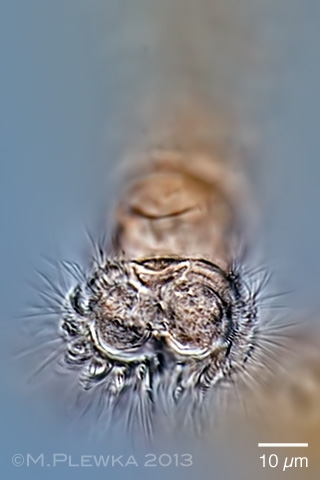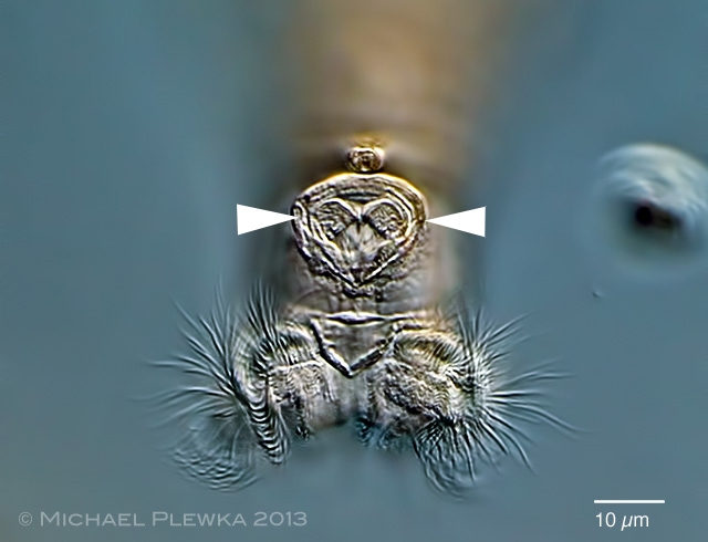 Um Rädertiere von vorn fotografieren zu können, muss ihre Körperlängsachse  parallel zur optischen Achse des Mikroskops sein. Bdelloide Rädertiere besitzen auf ihren Räderscheiben neben den eigentlichen Cilien frontale Tastborsten, welche eine reflexartige Kontraktion des Tiers bewirken, wenn sie irgendetwas berühren. Das könnte z.B. ein aufgelegtes Deckglas sein. Will man also die Viecher von vorn beobachten,  muss für diese Rotatorien die Schichtdicke des Präparates folglich mindestens so groß sein wie die Körperlänge der Tiere.  Dabei  sollten sie das Deckglas nicht berühren. Da muss man schon Geduld haben, dass man die richtige Gelegenheit erwischt.