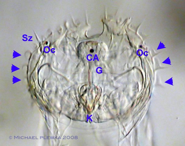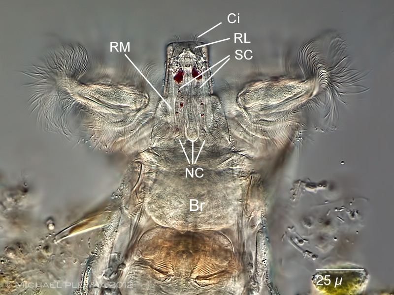 Planktische Rädertiere gehören zur Gruppe der monogononten Rädertiere. Im Gegensatz zu den bdelloiden Rädertieren sind bei diesen  Körperform und -proportionen alles andere als einheitlich. Auch lasssen sie sich nicht durch Deckglasberührungen so stören wie die bdelloiden.  Hier zwei Beispiele. Zunächst ein älteres Foto einer  Asplanchna priodonta. Es bedeuten: Oc: Ocellen; CA: Cerebralaugenfleck; G: Gehirn; K: Kauer;  Sz: Sinnesborsten. Die Pfeilspitzen deuten auf die Cilien des Wimpernkranzes: