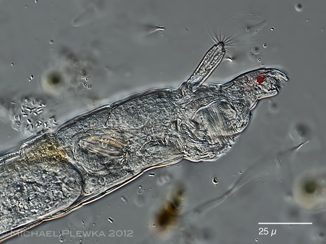 Nur selten sind bdelloide Rädertiere in Seitenlage zu finden. Das tritt eigentlich nur auf, wenn die Tiere an irgendetwas festgeheftet sind, das in entsprechender Orientierung unter dem Deckglas eingeklemmt ist, beispielsweise einer Detritusflocke.