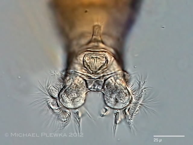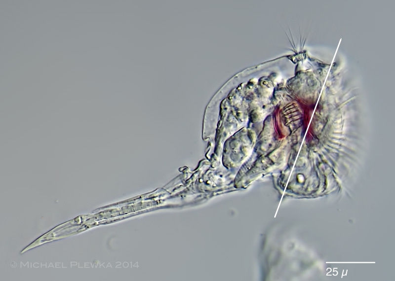 Zum Schluss noch ein optischer Frontalschnitt durch Microcodon clavus. Die rote Fleck in der Mitte ist ein Teil des Kauers, also kein Augenfleck o.ä. Die Aufnahme von der Seite zeigt die Ebene des optischen Schnitts: