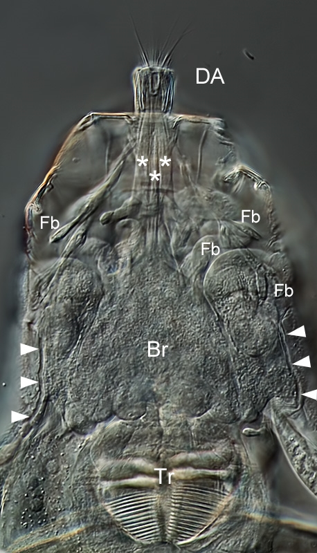 Das nächste Bild zeigt ein intaktes !!! Viech mit eingezogenem Räderorgan. Auffällig ist der Dorsaltaster (DA) oben im Bild. Von dort verbinden insgesamt 3 Nervenpaare (mit * gekennzeichnet) die cilienbesetzten Sinneszellen mit dem Gehirn (Br) im Zentrum. Rädertiere besitzen auch im Kopf exkretorische Organe, soganannte Wimpernflammen (Fb), welche mittels Cilienschlags Wasser über die Nephridialkanäle (mit Dreiecken gekennzeichnet) zur Blase befördern. Tr: Kauer.