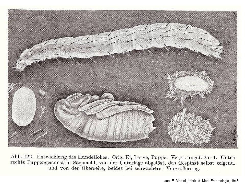 Interessant ist die Ernährung der apoden und acephalen Larven (beinlos und ohne Kopfkapsel): Diese entwicklen sich typischerweise im Nest des Wirts, d.h. im Vogelnest, Rastplatz des Säugetiers u.ä. und brauchen dafür geeignete Bedingungen (Ritzen, Feuchtigkeit, Nahrung), welche sie in einem heutigen Haushalt kaum vortreffen werden. Deshalb sind von Hunden und Katzen eingeschleppte Flöhe meist kein dauerhaftes Problem, ebensowenig die Vogelflöhe, die beim Reinigen von Nistkästen gerne stechen.