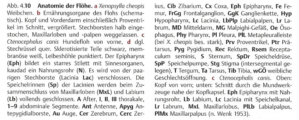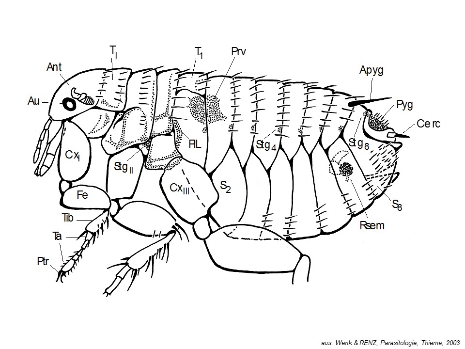 Zur Morphologie und Anatomie des adulten weiblichen Flohs noch zwei Bilder (der Floh von Mario ist ein Männchen, erkenntlich am mächtigen Penis, im Bild links unten im Adomen):