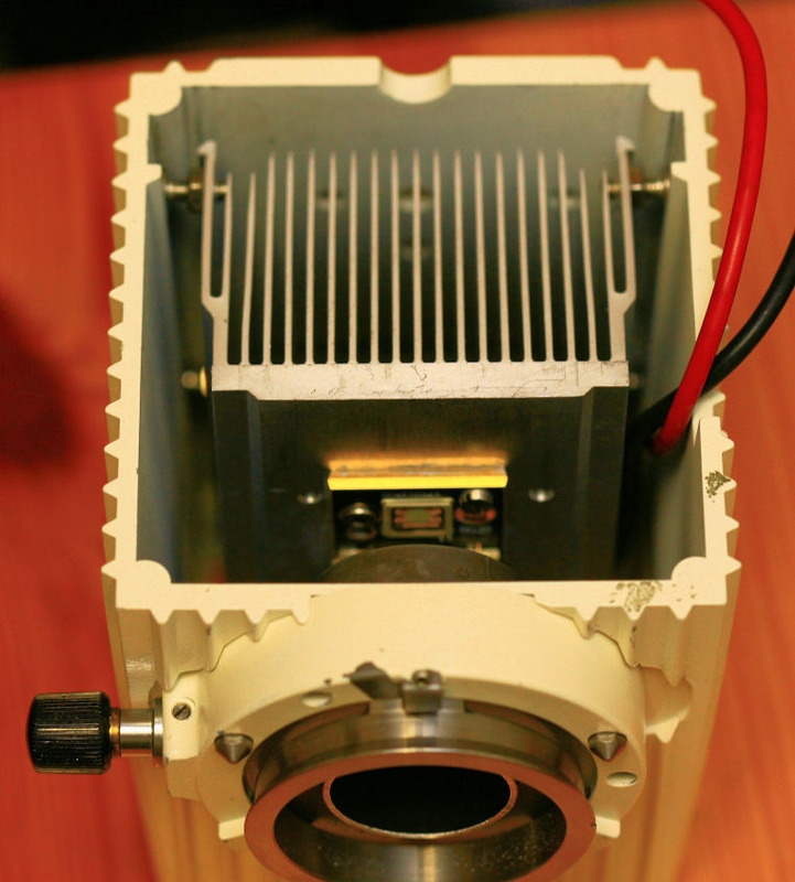 @Ronald - hier kann man zwar den Kollektor verstellen, aber auch ohne Verstellmöglichkeit ist die korrekte Platzierung der LED völlig unproblematisch. Die LED ist auf einem 3 mm dicken Kupferkörper (28 x 26 mm) montiert. Man kann sie damit problemlos auf dem Alukühler provisorisch festklemmen und in eingeschaltetem Zustand hin und herschieben - das wäre mit einer Halogenlampe schwer und mit einer HBO gar nicht möglich. Man projiziert dabei den runden Emitter genau senkrecht an die Zimmerdecke oder -wand und befestigt anschließend die LED endgültig in Gewindelöchern.