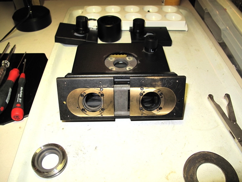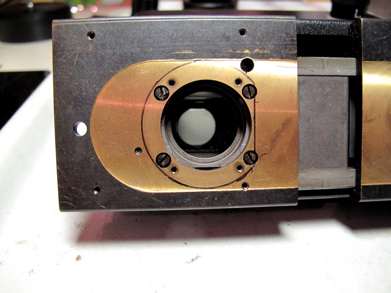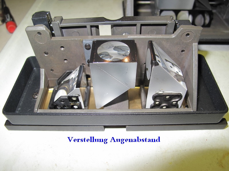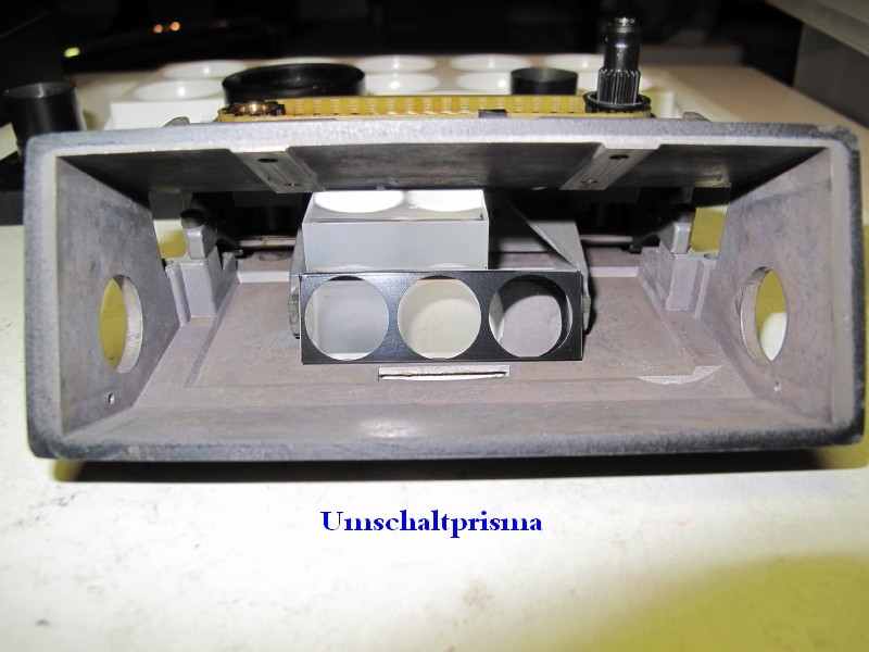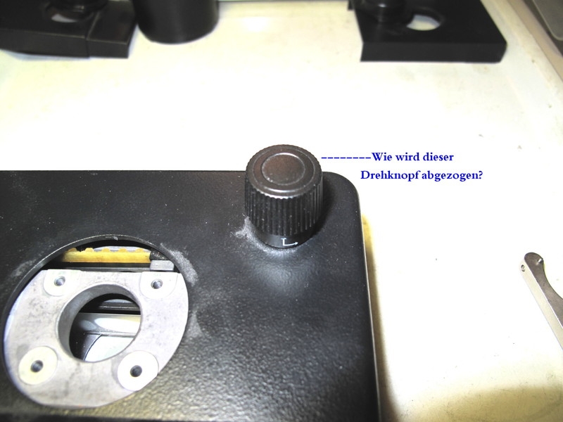 Nun möchte ich das Schrotteil nutzen um es kennen zu lernen: Frage wie zerlegen? Ich habe alle sichtbaren Schrauben entfernt, außer den auf dem ersten und 2. Bild sichtbaren. Da habe ich noch gezögert. Mir scheint, dass der Drehknopf für die Prismenverstellung erst abgezogen werden muss. Aber wie? Wenn man ihn tatsächlich abziehen kann, dann sitzt er sehr fest. Mit Gewalt wollte ich es erst mal nicht versuchen. Kennt jemand den Trick?
