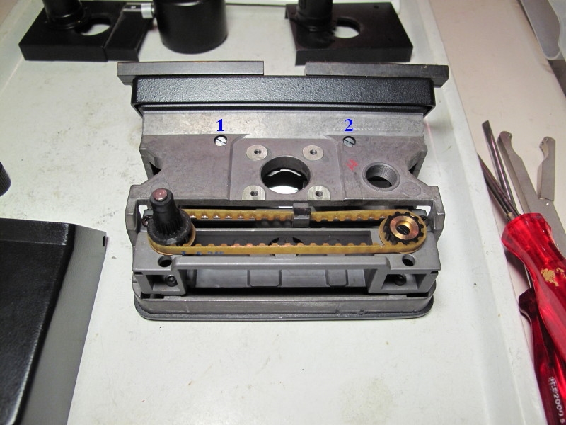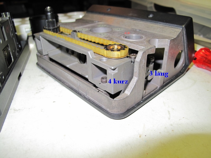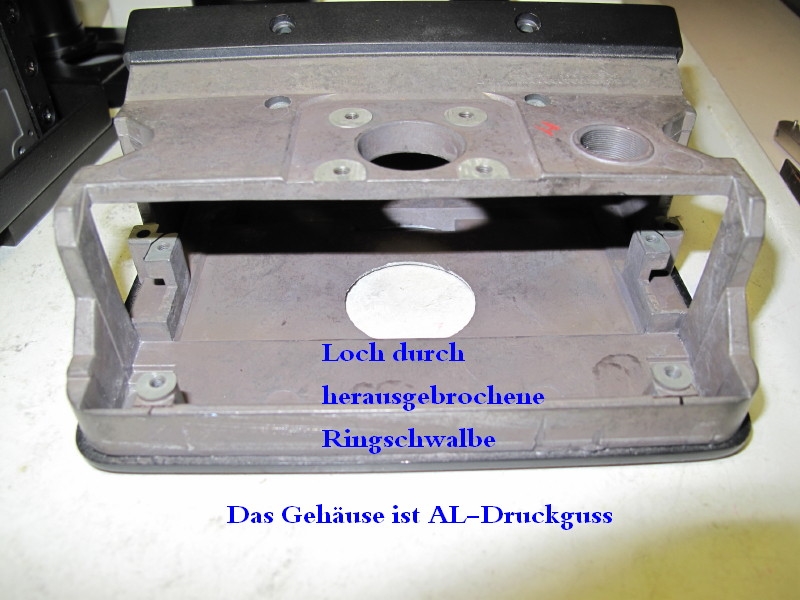 Nun habe ich einfach bei Leica angefragt, das war am Samstag und heute nachmittag hat mich ein altgedienter Service-Techniker angerufen. Der hatte genau den identischen Schaden schon mal und konnte mir exakt sagen wie vorzugehen ist: Der Drehknopf wird einfach abgehebelt - man darf sich nicht beirren lassen: es geht schwer! Danach kann man die eine Hälfte des Gehäuses herausheben. Schrauben 1 und 2 rausdrehen und das Frontteil für die Augenabstands-Einstellung herausziehen. Danach Schrauben 3 und 4 und auf der anderen Seite 5 und 6 herausdrehen, nun kann man das leere Gussgehäuse rausheben. Und dann sieht man: die Ringschwalbe ist aus dem Gehäuse rausgebrochen. Leider ist dabei das Gehäuse gerissen und verbogen. Man kann die Ringschwalbe nicht mal mehr einkleben.