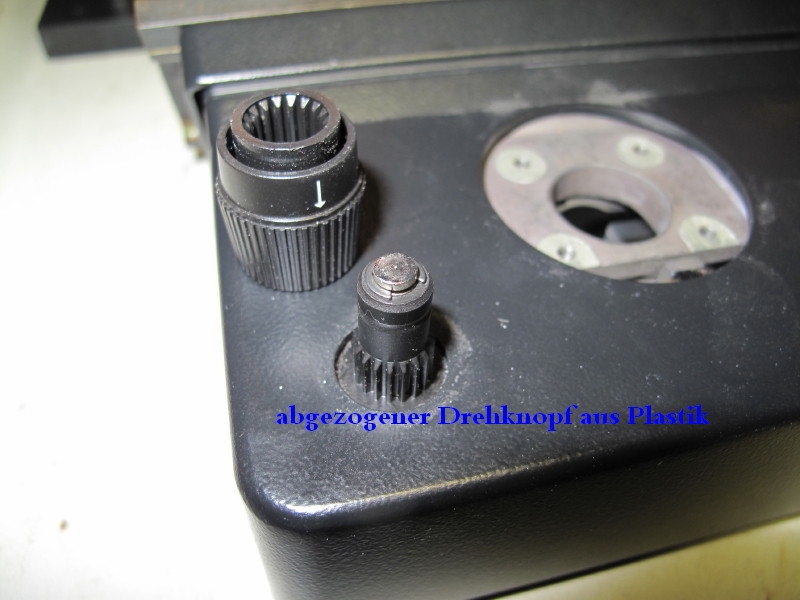 vielleicht lässt sich die Kappe am Drehknopf mittels Schraubenzieher abhebeln. Wenn ja, ist drunter eine Mutter - die lösen und der Knopf geht ab.