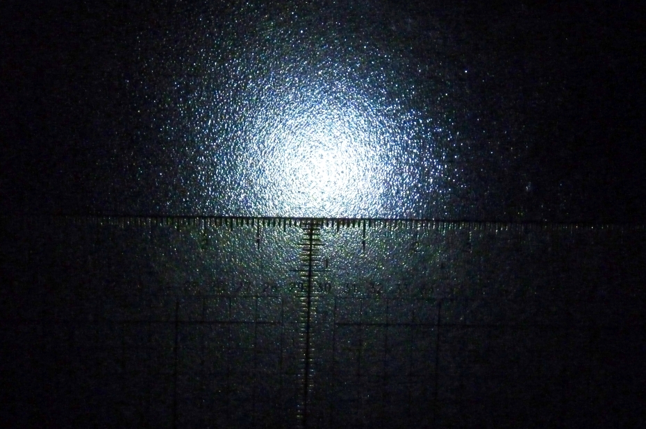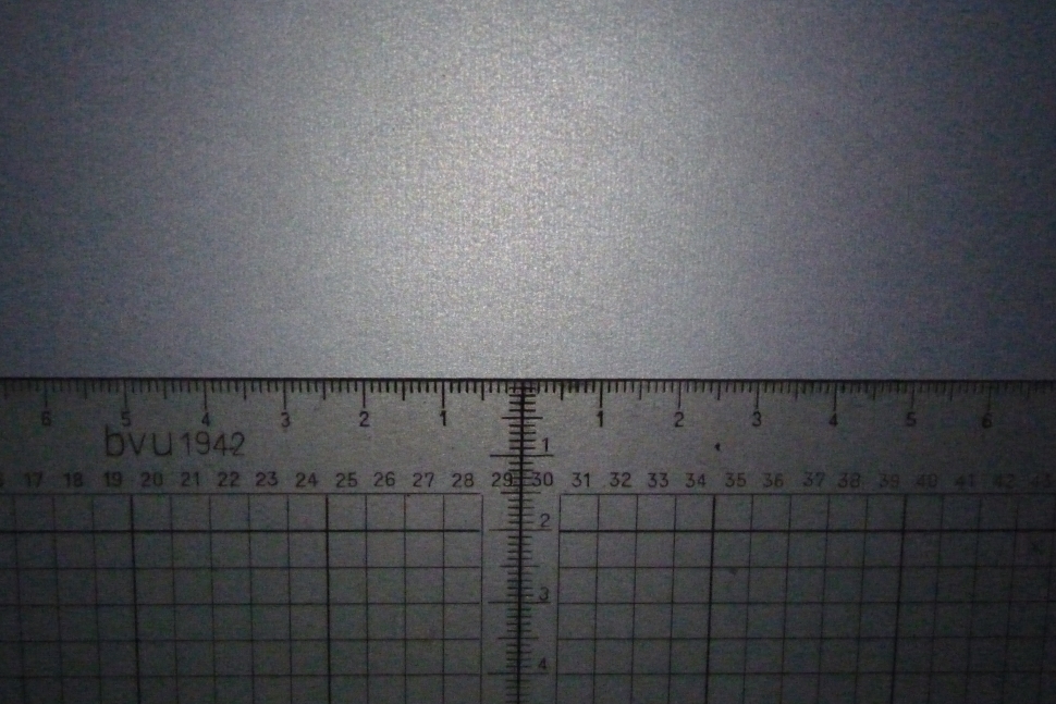 die Streuwirkung auch. Meiner Meinung nach viel zu gering. Ich habe eine ähnliche Klarsichthülle doppellagig getestet, im Bild sieht man die Streuwirkung um eine Punktlichtquelle (1 cm des Maßstabes entspricht ca. 1° Streuwinkel). Die erreichten etwa 2° Streuung sind zu wenig: