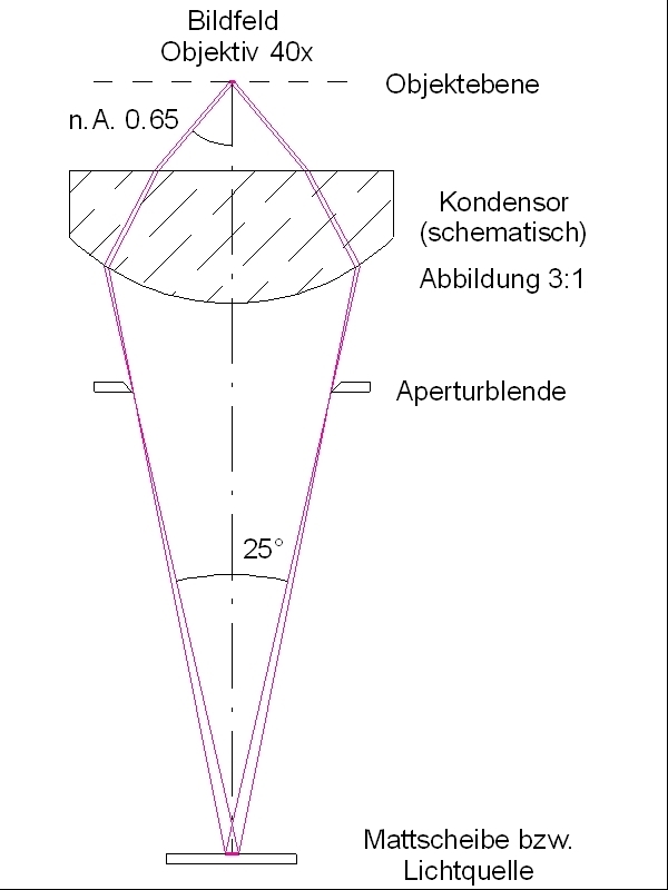 Für eine ausreichende Ausleuchtung des Kondensors mit einer n.A. von 0.65 wie bei deinem Mikroskop benötigt man beispielsweise etwa 25° gleichmäßige Ausleuchtung durch die Leuchtfläche, das folgende Bild zeigt die geometrischen Verhältnisse der kritischen Beleuchtung mit einem angenommenen typischen Kondensor-Abbildungsmaßstab 3:1. Wenn die Kollektorlinse unterhalb der Mattscheibe nicht optimal angepasst ist, benötigt man einen noch größeren Diffusor-Winkel: