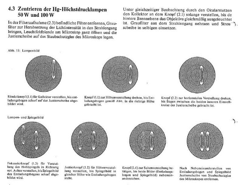1) Ich stehe vor dem Problem, wie ich die Zentrierung korrekt vornehmen soll. Vielleicht stehe ich auf dem Schlauch, aber ich begreife die Anleitung hier einfach nicht. Die Leuchte ist ja im Auflicht-Strahlengang (AL-Fluoreszenz). Die Anleitung von würde ich aber so verstehen, als sei dort eine Zentrierung im Durchlichtstrahlengang beschrieben  ??? Das Lampenhaus 100 Z stammt aber sicher aus einer Zeit, als DL-Fluoreszenz lange Geschichte war. Wo ist der Knackpunkt meines Verständnisses?  Weiß jemand, wie man eine solche Zentrierung der HBO am Leitz-Mikroskop mit diesem Lampenhaus durchführt?