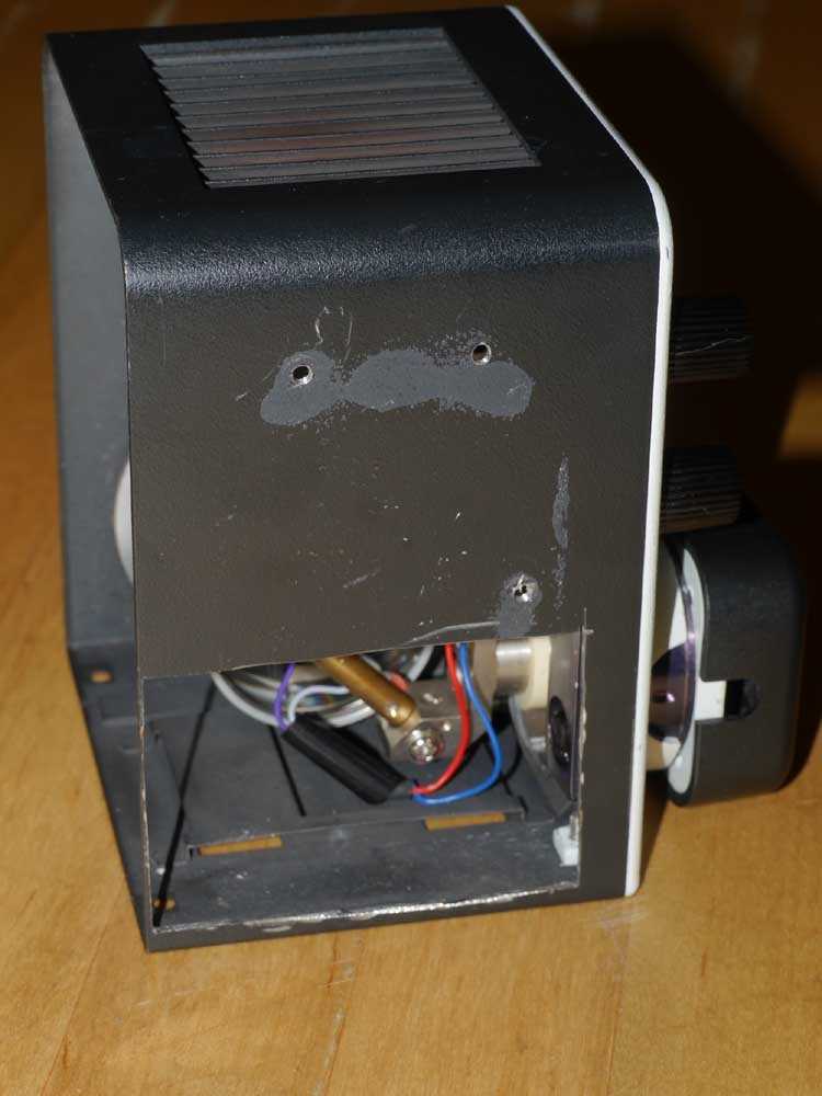 Das Lampenhaus 307-143.004  wird zunächst vom Spiegel befreit. In die Rückwand wird mit einer kleinen Trennscheibe (Dremel) eine Aussparung geschnitten, in die der Blitz (hier: Metz Mecablitz 52 AF-1 Oly) zentriert zur Kollektorlinse eingesteckt werden kann. Unten wird diese Aussparung etwas größer gehalten, damit der Blitz später mit einem (Holz-) Keil fixiert werden kann.