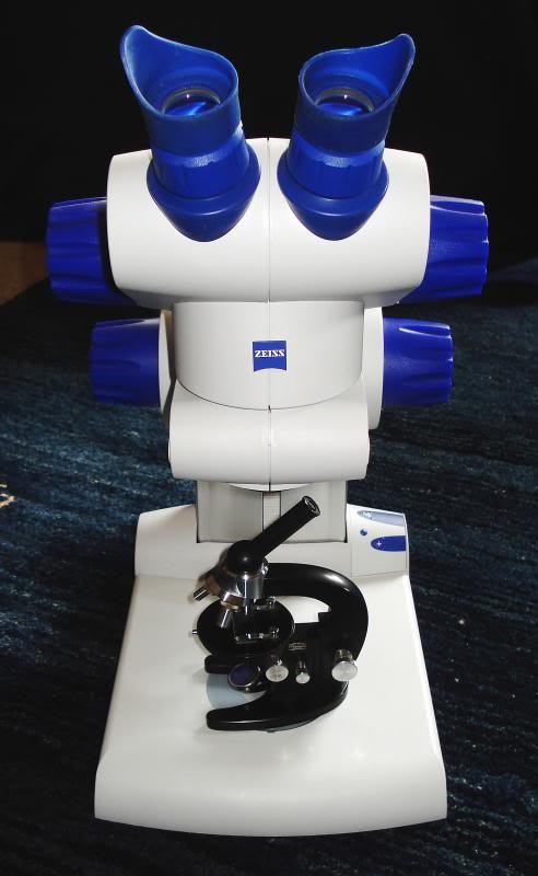 Mittlerweile hat Zeiss sein Stemi-Programm in Teilen neu aufgelegt und das Stemi 2000 durch das Stemi 508 ersetzt. Besonders interessant ist aber der Nachfolger des DV4, nämlich das Stemi 305 und hier speziell das Stemi 305 EDU. Dieses Mikroskop konnte ich auf der Kornrade bei der Firma Jülich testen und es hat (nicht nur mich) absolut begeistert. Ein solides, professionelles, ästhetisch designtes  (und äußerlich auf den ersten Blick von seinem "großen Bruder" kaum zu unterscheidendes) Zoom-Stereomikroskop, das mit einem Vergrößerungsbereich von 8 - 40-fach den "üblichen" Stemi-Bereich abdeckt. Es bietet ein angenehm großes Gesichtsfeld, über die Qualität des Bildes an sich muss man bei Zeiss wenig Worte verlieren. Der Clou ist, dass es bereits in der Grundversion mit einer eingebauten hellen LED-Beleuchtung für Auflicht, Durchlicht-Hellfeld und Durchlicht-Dunkelfeld(!) kommt. Vom ganzen "Feeling", auch der einzelnen Bedienelemente, ist es ein echtes Zeiss-Gerät, mit dem man einfach gerne arbeitet und das man gerne auf dem Arbeitstisch stehen hat.
