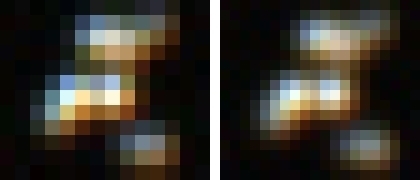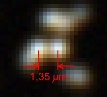 Martin hat bereits aus dem Bereich Astronomie ein Beispiel genannt. Die Mikroskopie unterscheidet sich nicht wesentlich davon. Das Nyquist-Shannon-Theorem der zweifachen Sampling-Frequenz gilt nur theoretisch für ein periodisches Signal, in der Praxis wird auch hier etwa die 2.2 - 2.5-fache Frequenz verwendet (z.B. bei der Musikdigitalisierung). Und je nach zusätzlichen Problemen wie z.B. Rauschen oder einer farbabhängigen Auflösung müssen Zuschläge gemacht werden. Das folgende Bild zeigt ein Objekt mit (u.a.) zwei "Bildpunkten" etwa gleicher Intensität, deutlich unterhalb der Auflösungsgrenze des Objektives (10x/0.25). Der Punktabstand entspricht etwa der Objektivauflösung von etwa 1.35 µm, mit 5 Pixel Abtastung. Die Beugungsstruktur ist deutlich sichtbar, die Abtastung daher eigentlich schon etwas zu hoch: