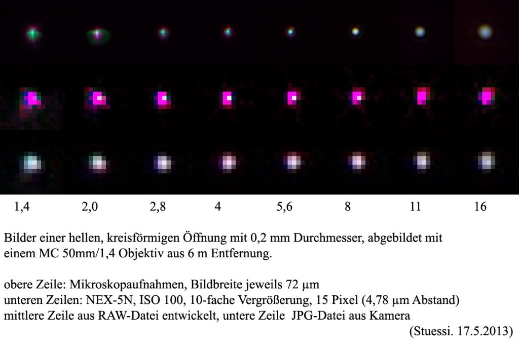 eine interessante Darstellung der Bilderzeugung in der Kamera. Allerdings verstehe ich die Botschaft nicht ganz. Ob ohne oder mit Anti-Aliasingfilter, ohne oder mit interner Softwarekorrektur der RAW-Daten, die Physik lässt sich nicht überlisten. Die Anforderungen an die Pixelzahl zur Trennung der Beugungsbilder ändern sich dadurch nicht allzu stark, außer wenn das AA-Filter zu intensiv wirkt und die Bildinformationen zu weit über die Bildpixel verschmiert. Da soll es ja bei den verschiedenen Kameramodellen deutliche Unterschiede geben.