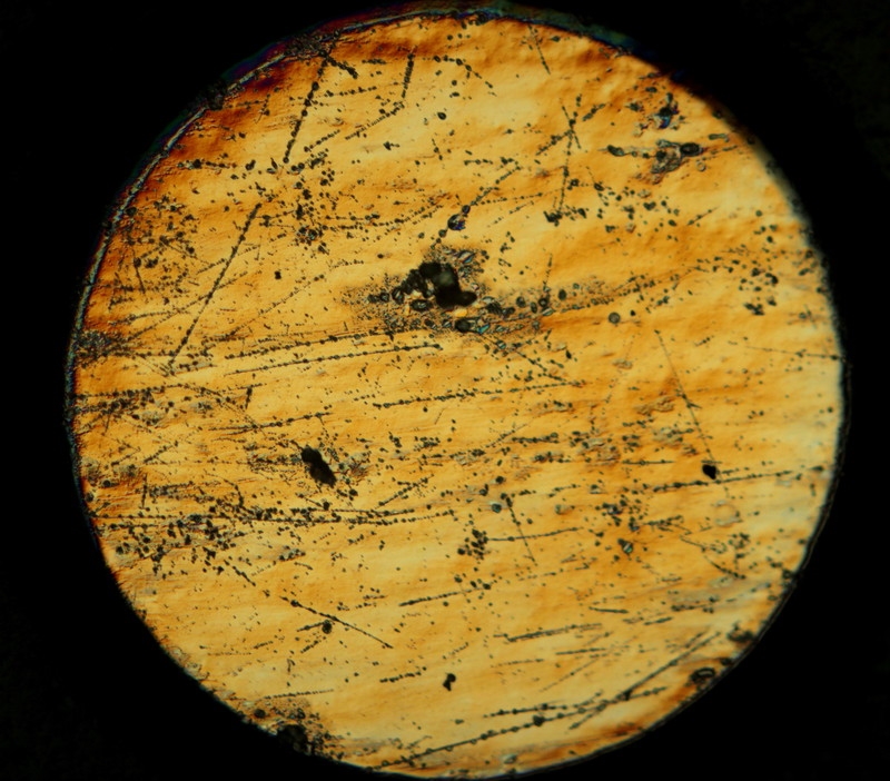 ich halte das für einen alten angelaufenen Querschliff eines in Glas eingebetteten Drahtes (Nickel?). Vermutlich aus irgendeiner defekten Lampe aus Deinem unendlichen Fundus.