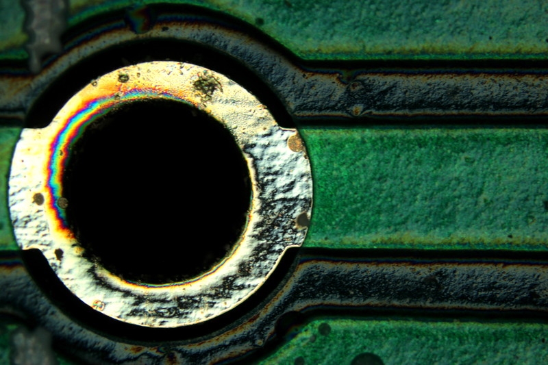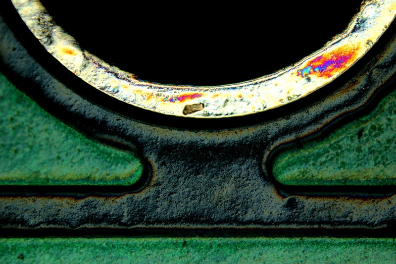 Nein keine verglühenden Euronen, oder am Horizont aufsteigende Drachmen, auch keine metallisierten Schmetterlingseier, sondern Lötstellen in der Platine eines verblichenen Chips einer Motic-Videokamera. Dazu mehr in einem separaten Beitrag, weil er so schön spannend ist.