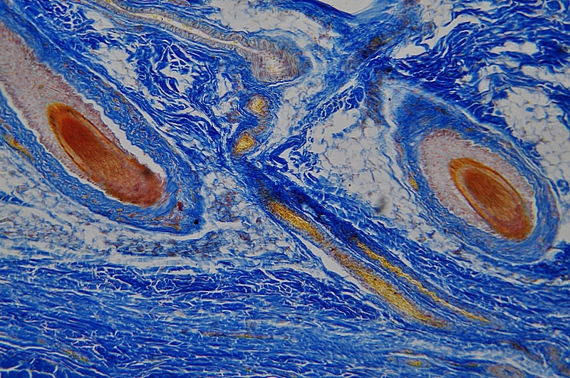 Dieses Präparat ist von einem älteren Menschen, denn die Haarfollikel stehen weniger dicht. An der Kopfhaut sind die Haarfollikel besonders lang und die Talgdrüsen zahlreicher als in anderen Regionen.