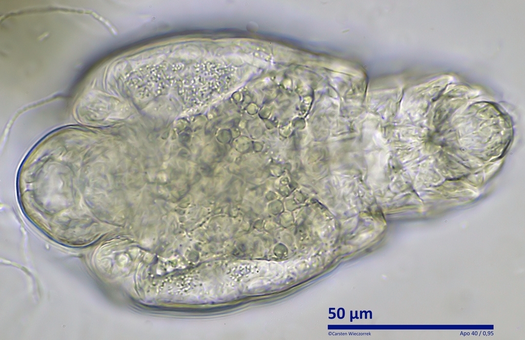 Bdelloide Rädertiere sind eine sehr schwierig zu bestimmende Gruppe. Man braucht viel Geduld und Glück, um ein solches Viech beim Rädern zu beobachten. Oft klappt es nie. Also viel Glück!