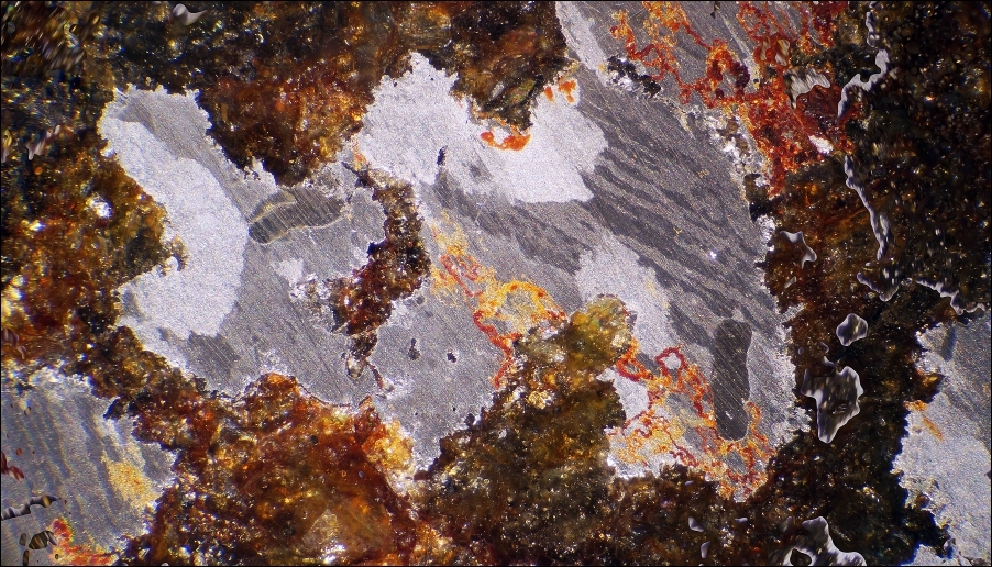 Ich fotografierte eingedeckt mit Silicon unterm Deckglas und variierte Beleuchtung und Orientierung der Probe. Die Strukturen im Eisen waren so gut reproduzierbar abzubilden.