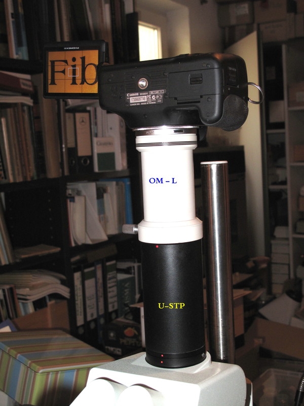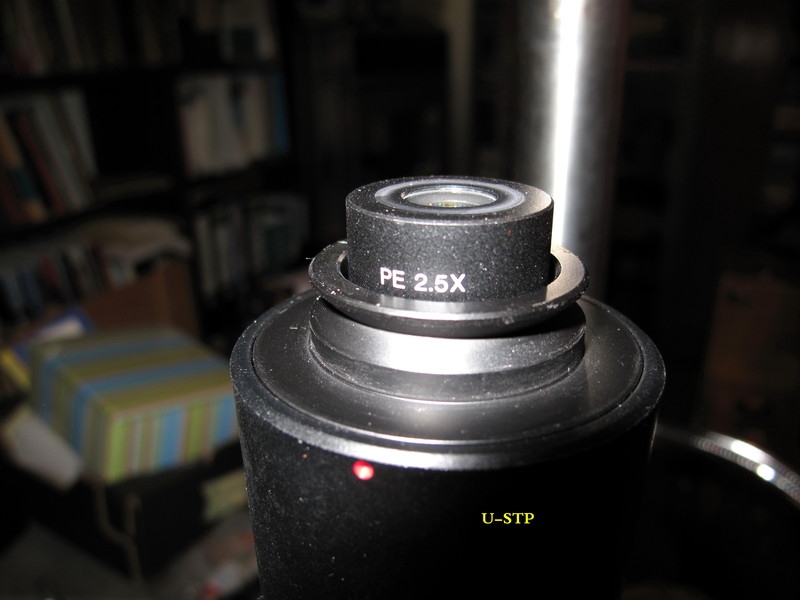 ich gestehe, die wichtige Regel verletzt zu haben, die da sagt: erst testen dann reden. Hier das Ergebnis. Jon hatte Recht: der U-STP in Kombination mit einem PE 2,5 und da drauf den Fotoadapter OM-L (aus der alten OM-Serie) funktioniert parfokal. Der OM-L hatte im Original ein OM-Bajonett drauf. Der von Matt gezeigte ist sicher eine Modifikation mit einem T2 (?)-Gewinde. Ich habe einen Adapter OM-EOS verwendet und da dann die EOS 600 drauf gesetzt.