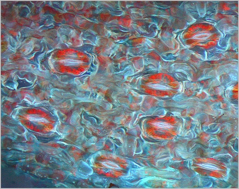 Zunächst die Blattunterseite mit den Stomata (alle mit 365nm Anregung und etwa Zeiss Filtersatz 02)