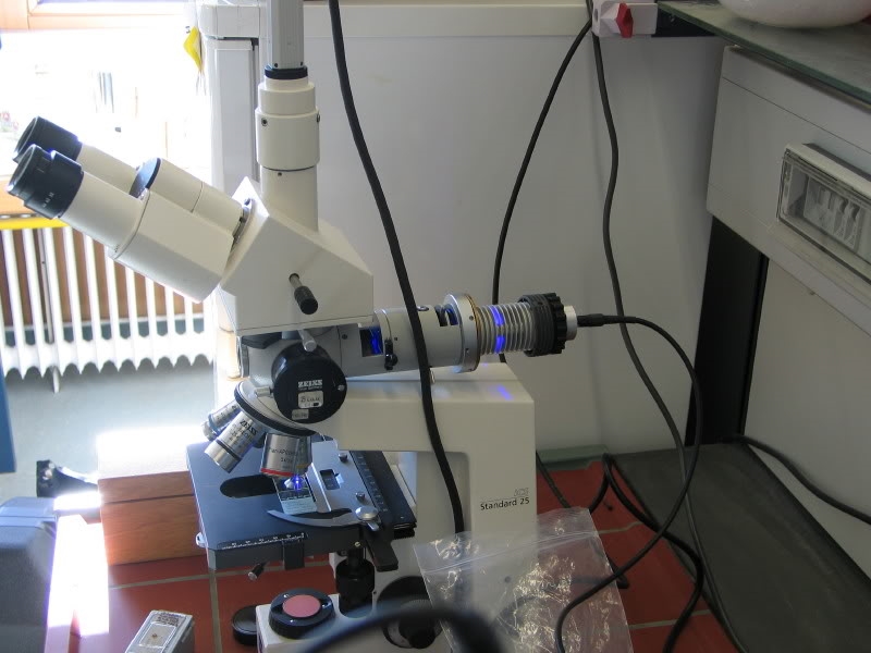 Bereits ein Zeiss Planapo 10/0,32 hat nur 0,35mm Arbeitsabstand , die Neofluare etwas mehr, aber ab 25/0,6 sollte schon ein Deckglas vorhanden sein.  Also müssen reine Auflichtobjektive her. Da der Mensch aber kaum alles besitzen kann ...... kommen die Experimente.