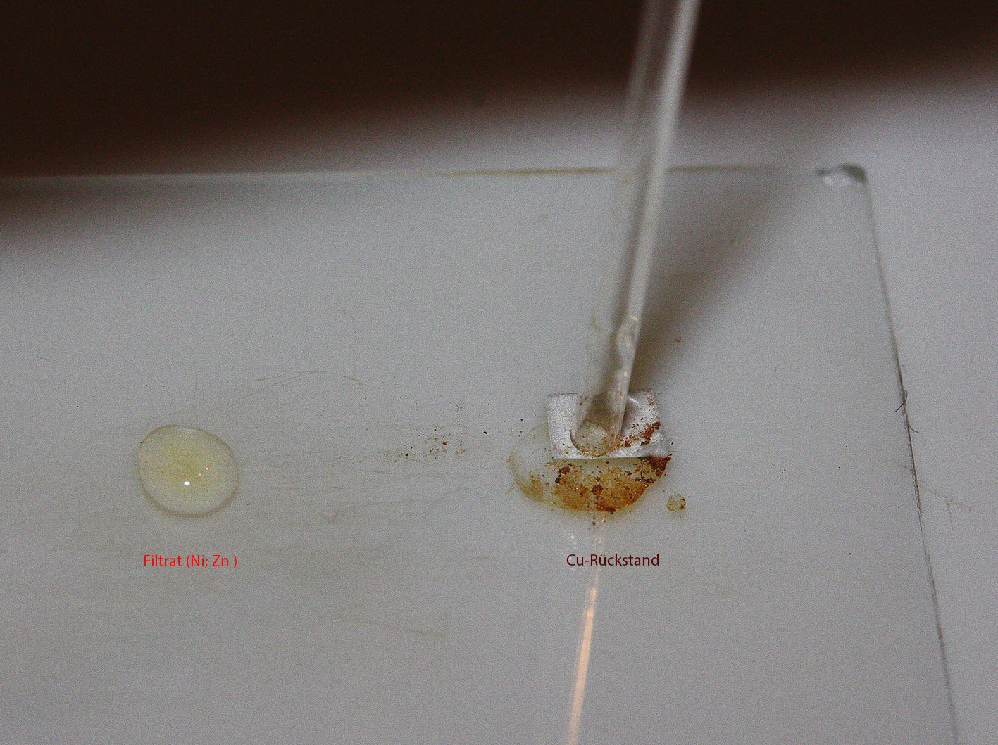In den beiden letzten Bildern sieht man zunächst die gesamte "Schlachtplatte", so wie sie am Ende vorliegt, dann am Ende den Nachweis des Zn als Zn-Dithizonat.