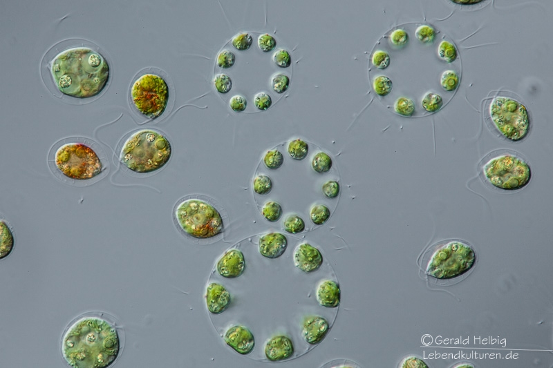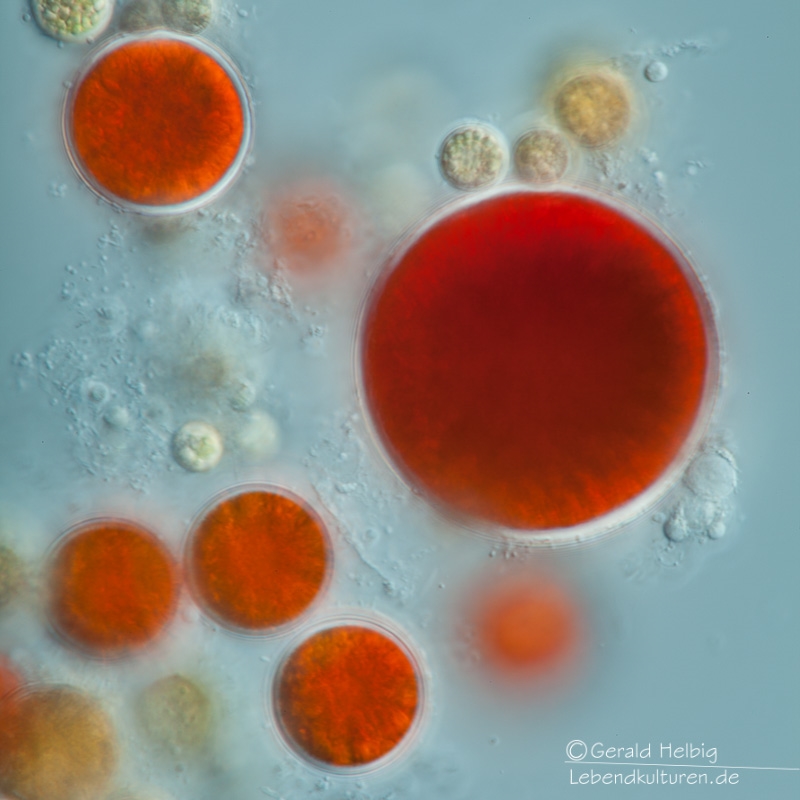 Ein interessantes Bild: keine Mischkultur von Haematococcus pluvialis und Stephanosphaera pluvialis wie es oft in der Natur vorkommt. Sondern das Bild zeigt zwei Stadien dieser Alge: als achtzellige Kolonie oder einzellige Alge im Übergang vom oder ins Palmellastadium (Dauerstadium). Hier ist die Kultur langsam beim Eintrocknen und somit befinden sich die Zellen im Übergang zum Palmellastadium. Für die Kultur benötigt diese Alge (wie auch die Blutregenalge) immerwieder diesen extremen Wechsel.