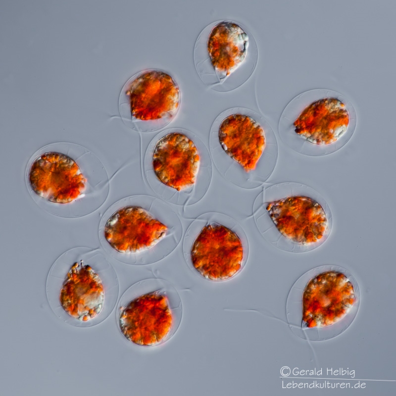 Die Zellen von Stephanosphaera sind meiner Beobachtung nach etwas größer als von Haematococcus. Hier noch ein Bild aus einer Rohkultur.