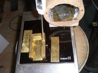 Eine objektträgerbreite  " Messingbucht" ( Klebeschrank ) mit Löchern um Temperaturfühler reinzustecken, sorgt für gute Temperaturverteilung, und zusammen mit dem Korkabkühlschrank für langsames Abkühlen.